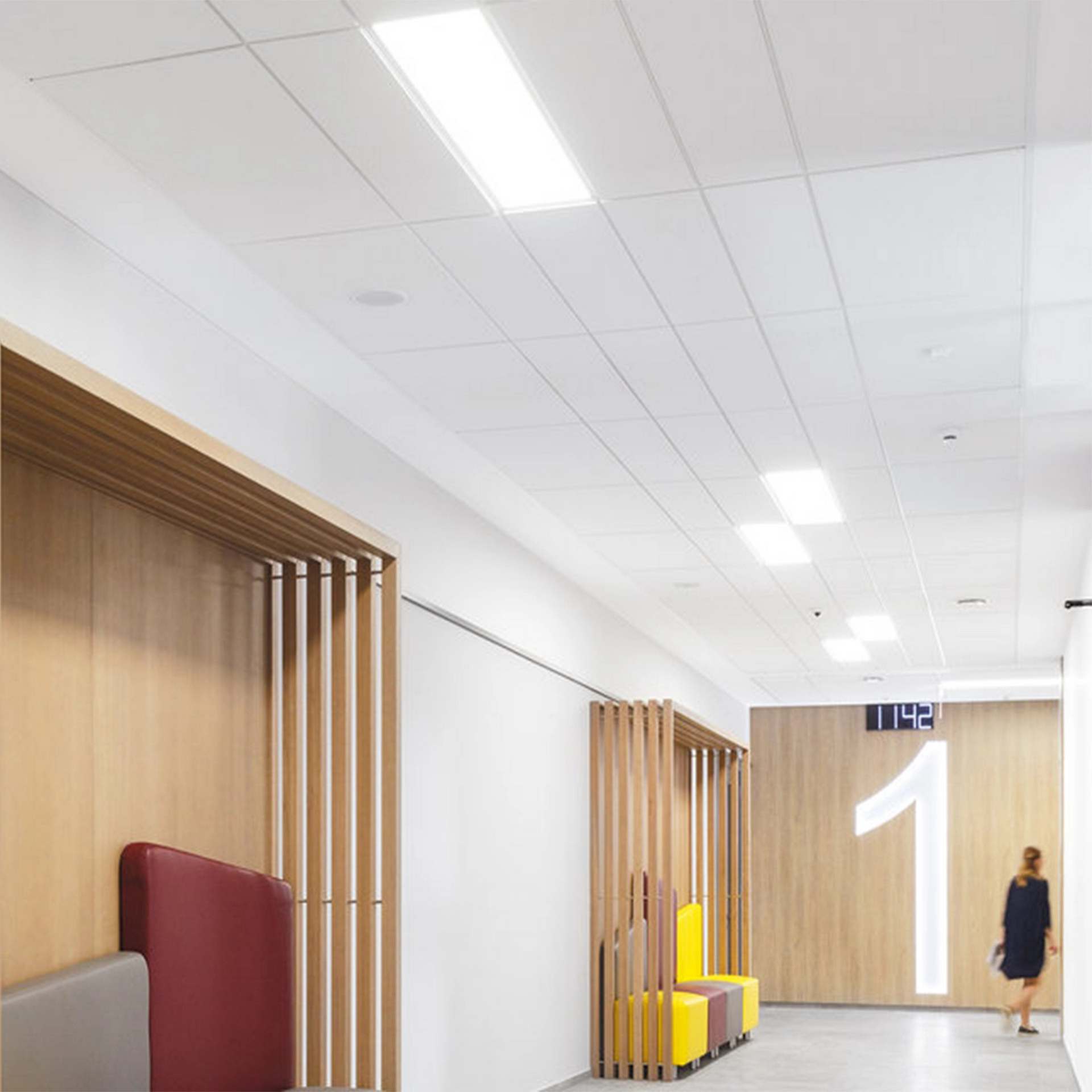 Placa acústica de lana mineral biosoluble con superficie lisa laminada, diseñada para ofrecer máxima absorción sonora con un NRC de 1.0, además de un buen aislamiento entre ambientes (dw 29 dB). Esto garantiza confort acústico y privacidad en espacios de alto uso y circulación constante.