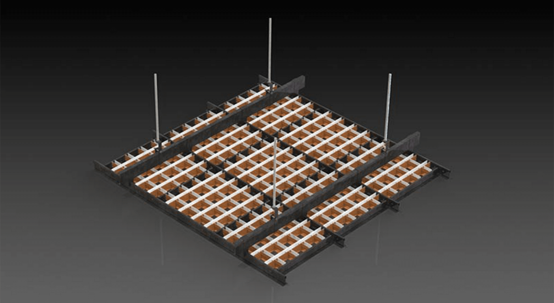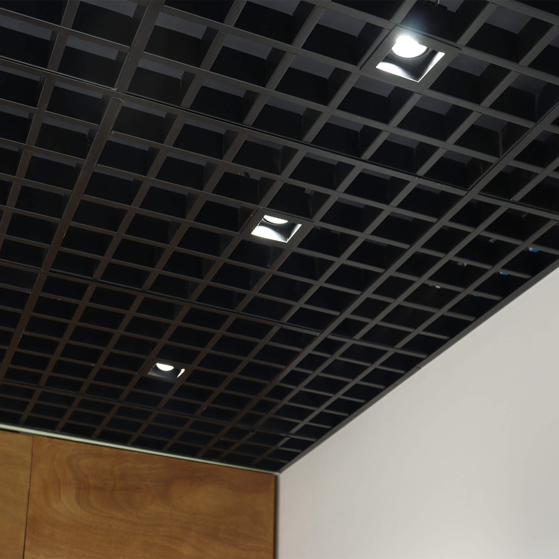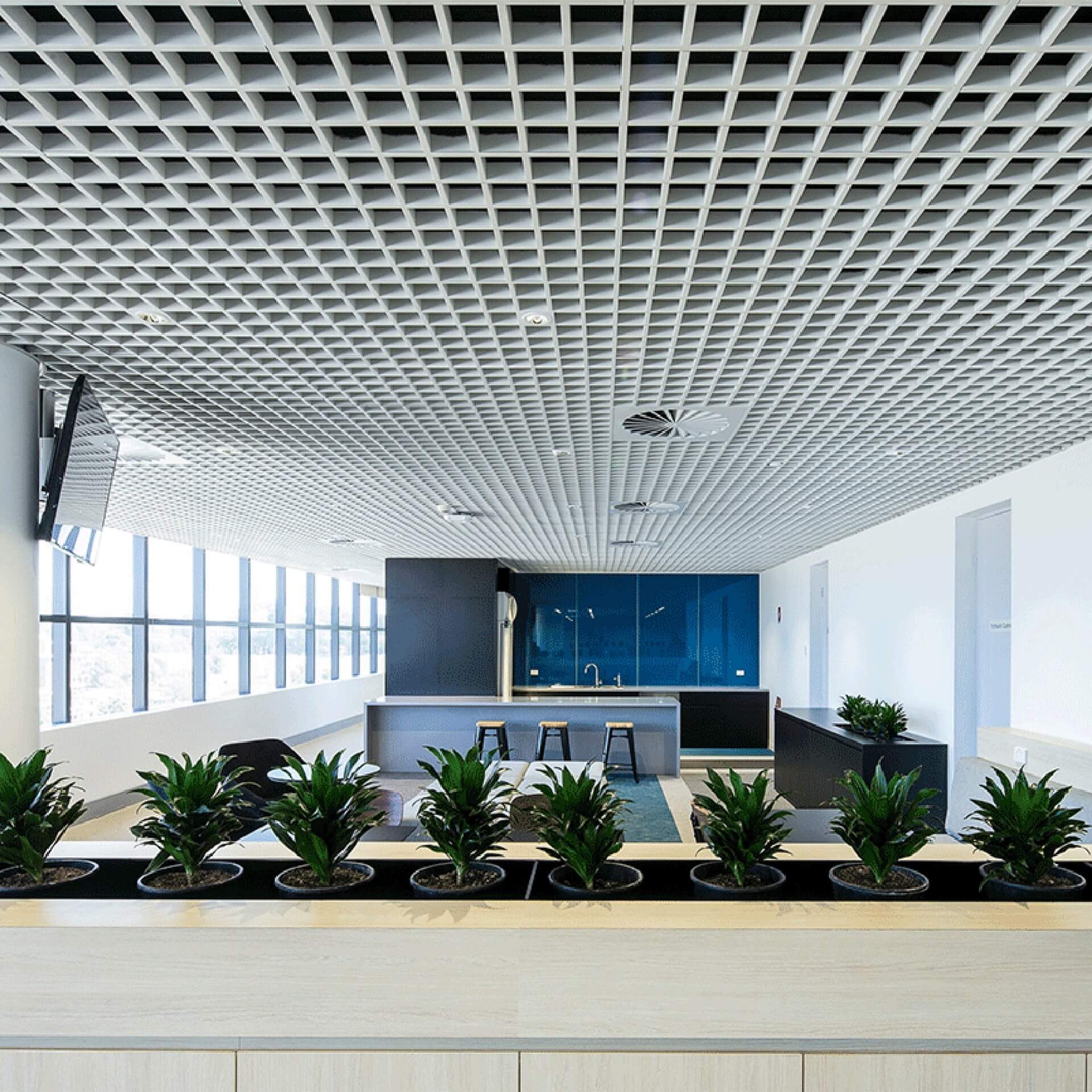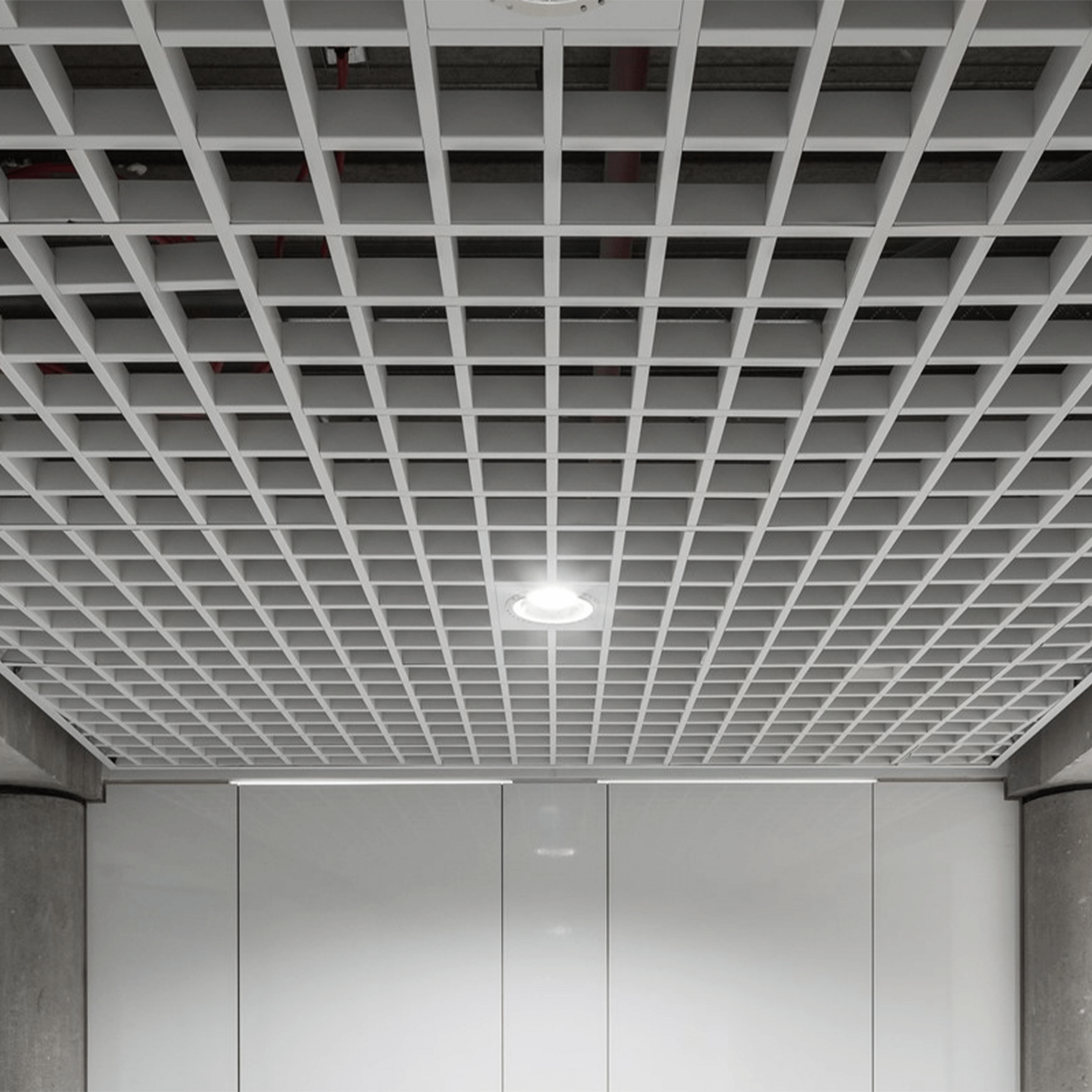 El S17M Cell es un plafón metálico conformado por tiras de acero galvanizado que se ensamblan en módulos de 0.60 × 0.60 m, instalados sobre un sistema de suspensión 9/16” para lograr una apariencia continua y limpia.