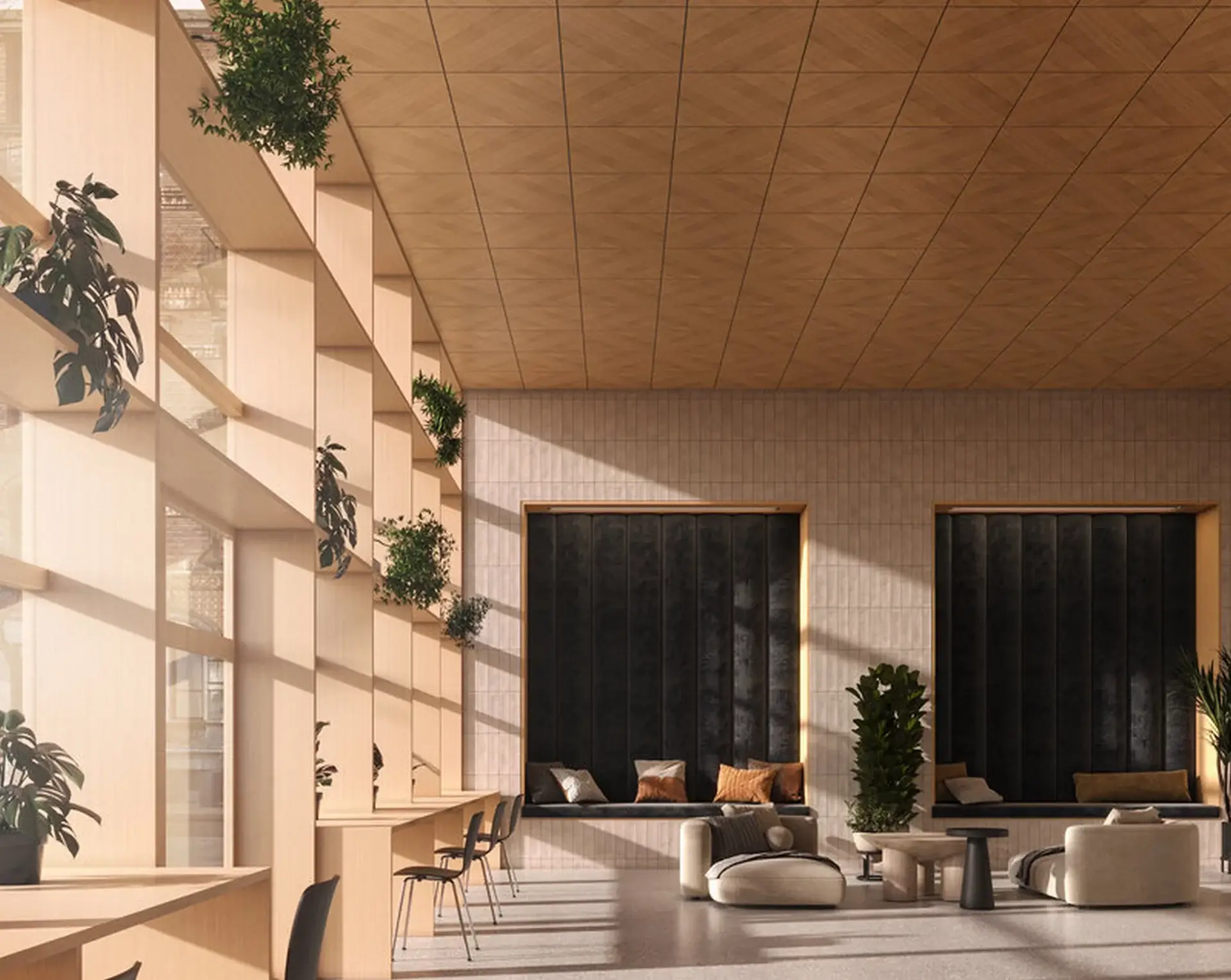 Varioline Wood Larch es una placa acústica fabricada en lana mineral biosoluble certificada, diseñada para aportar calidez visual y una estética contemporánea gracias a su acabado liso tipo madera.